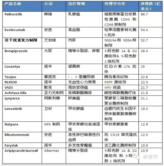 在這一最有價值的新藥申請領域中,也就是說不再處于研發階段,輝瑞公司的細胞周期蛋白依賴性激酶CDK4和CDK6的選擇性抑制劑palbociclib的淨現值,低于福泰制藥公司Kalydeco和lumacaftor組成的複方制劑。與此同時,枯草溶菌素轉化酶9抗體領域的競賽,處于并駕齊驅的狀态,安進公司等待獲得批準的evolocumab淨現值爲54億美元,賽諾菲和再生元合作研發的、處于III期臨床的alirocumab淨現值被敲定在57億美元。