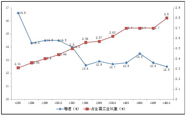 圖1 2012-2014年醫藥工業增加值累計增速與占比