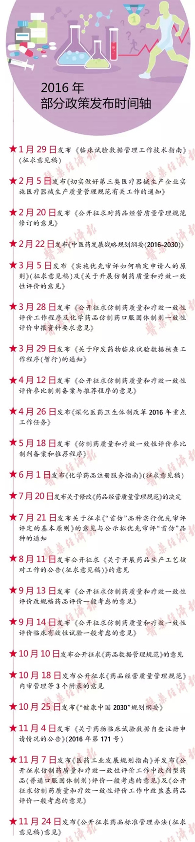 2016年已步入尾聲,縱觀這一年,中國醫藥産業産生實質性分化并朝着規範化邁進。截至11月底,今年由國家及國家部委局發出涉及醫藥新政的文件超過45份,地方與國家及各部委局配套的文件有上百份之多;涉及國有醫藥企業改革的國家及國家部委局層面文件9份,截至11月底,已有31家國有企業按照國企改革政策實現重組。